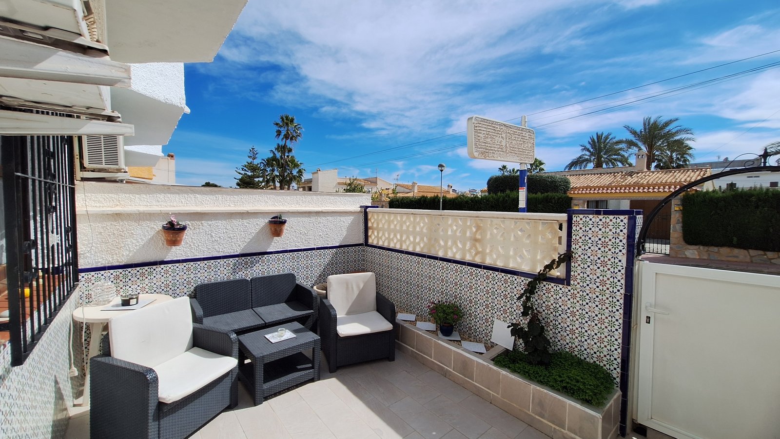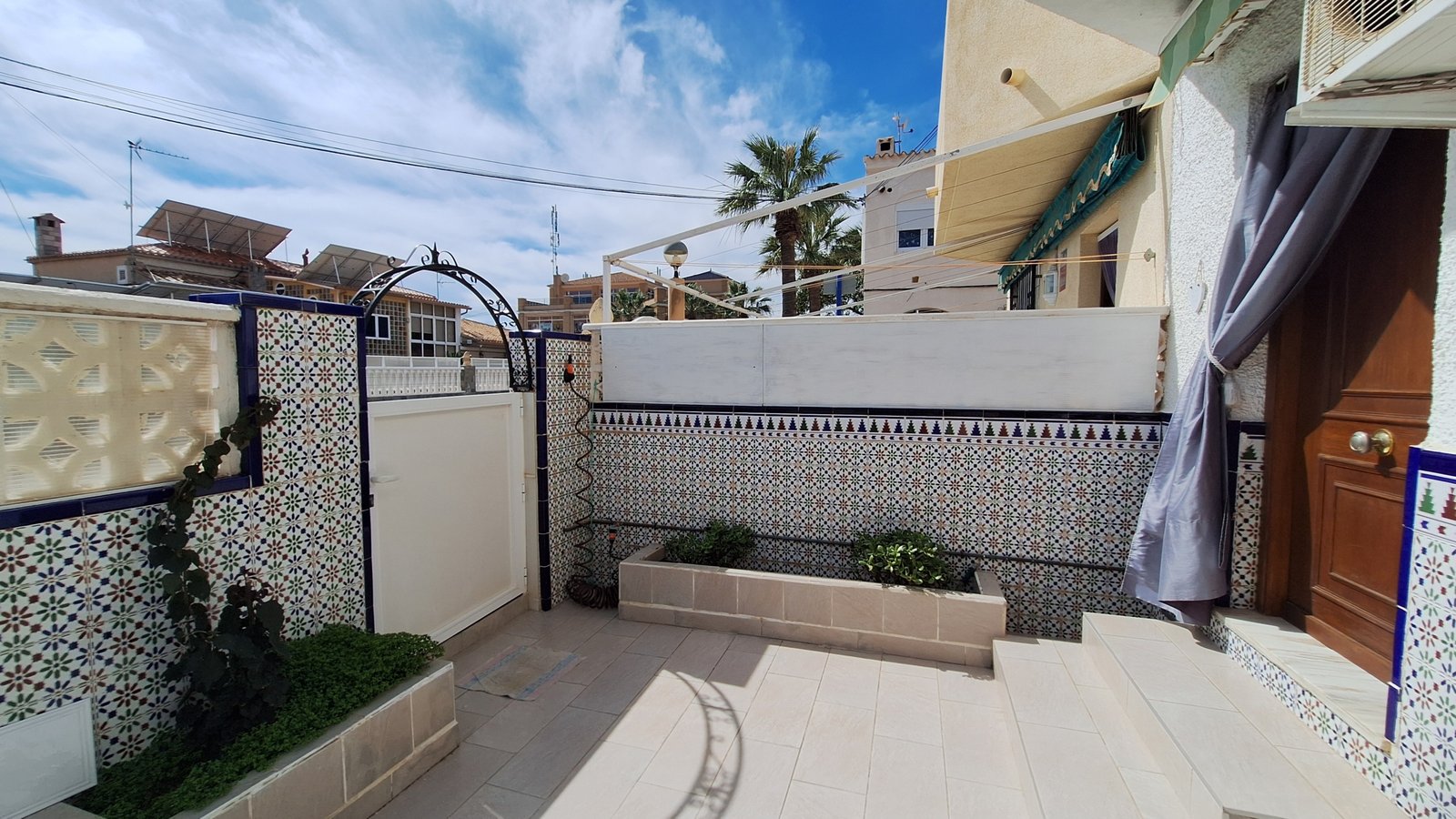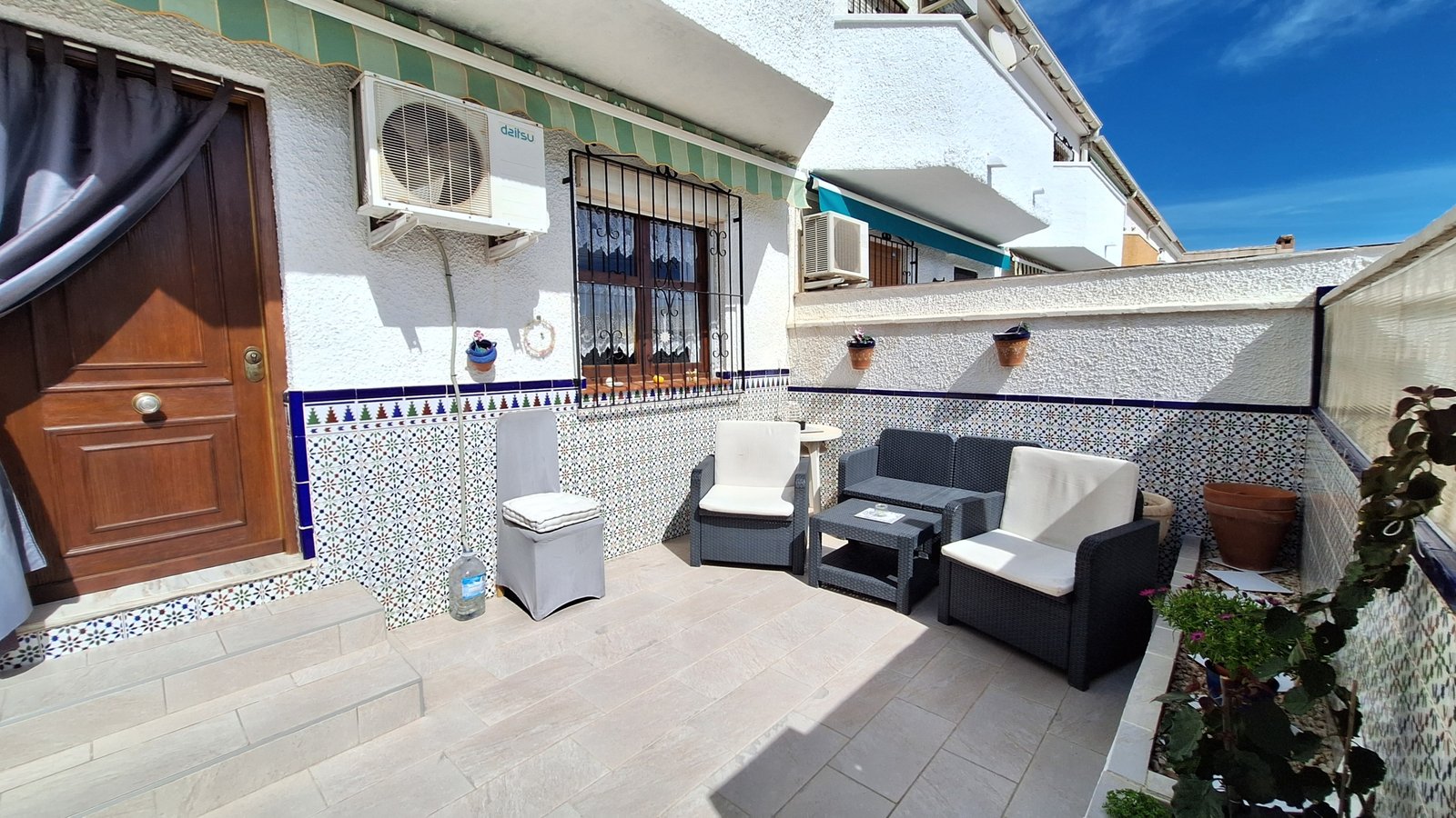 Se accede a la vivienda desde una terraza delantera con orientación sur oeste, ideal para relajarse al aire libre, desayunar o disfrutar del clima mediterráneo y del sol durante todo el año.